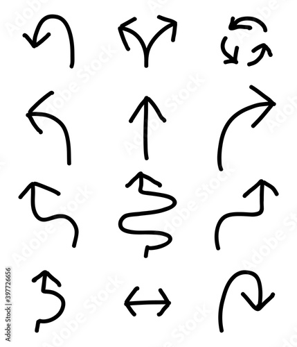 Set of black handdrawing in multiple shape of arrow symbol on white background