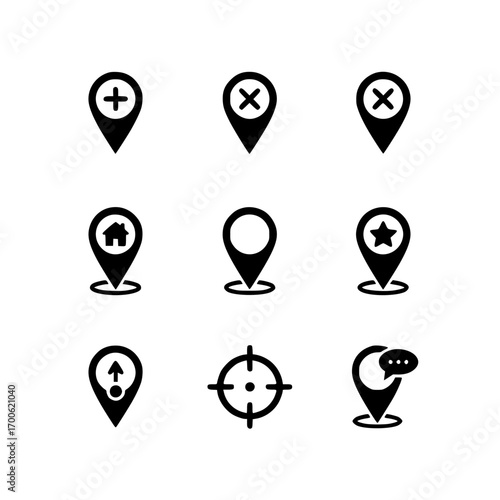 location, map, pin, marker, navigation, position, global positioning system, point, destination, icon, symbol, pictogram, glyphs, set, collection, vector, graphic, illustration, app, web, interface, black, summing, plus, delete, remove, close, home, house, star, favourite, direction, target, aim, speech bubble, chat