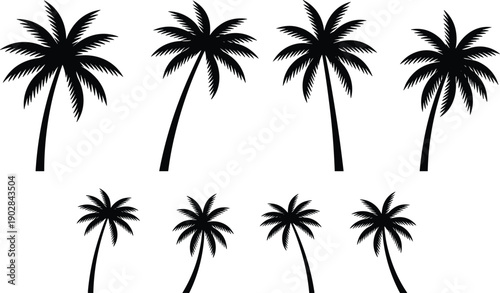 Set of black palm tree silhouettes isolated on white background, tropical summer collection for beach design, travel branding, vacation logos, nature icons, vector illustration,