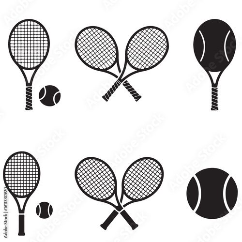 SET OF BLACK VARIOUS single Tennis racket and ball, two crossed rackets and tennis ball icon SILHOUETTES