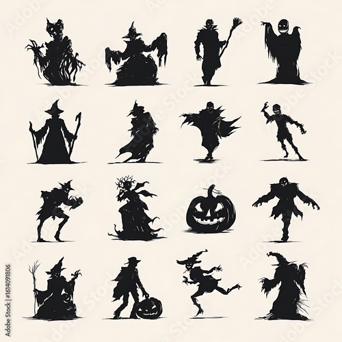 Set of black vector Halloween dancing people silhouettes illustration