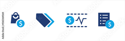 Set of blue financial and shopping icons with dollar signs, price tags, discounts, charts, invoices, and calculators. Business and commerce UI elements for web, app, banner, and print design.
