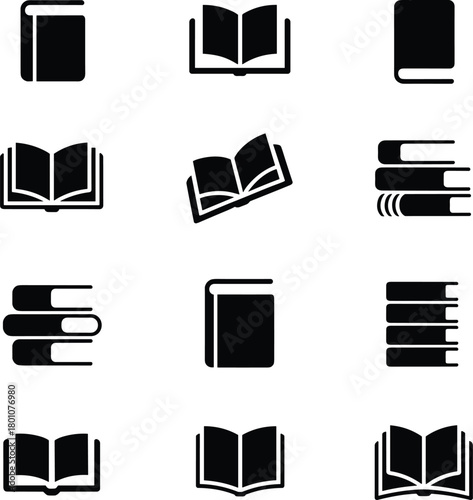Set of book and open book vector icons, stack and single book silhouettes, black isolated design for library, education, reading material, cad drawing flat vector illustration