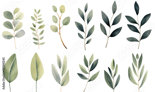 set of Branches leaves green plants in watercolor illustration png isolated on a transparent background, clipart
