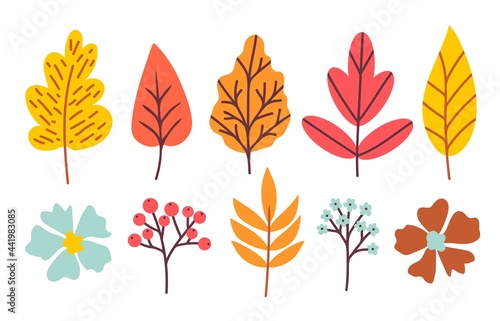 Set of bright autumn leaves, rowan berry flowers, twigs. Colored vector illustration for seasonal design.
