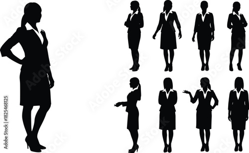 business, woman, silhouette, vector, suit, corporate, office, female, professional, manager, standing, pose, collection, set, executive, businesswoman, office worker, business suit, isolated white, human resources, career woman, full body, black-and-white, isolated on white