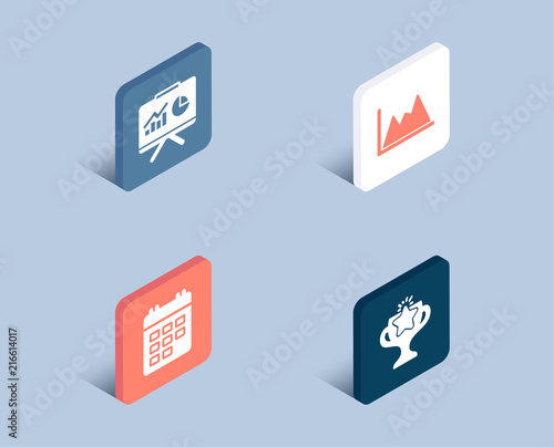 Set of Calendar, Presentation and Diagram icons. Victory sign. Event reminder, Board with charts, Growth graph. Championship prize. 3d isometric buttons. Flat design concept. Vector