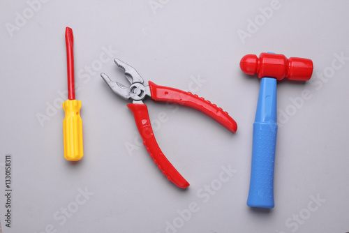 Set of children's toy tools on a gray background