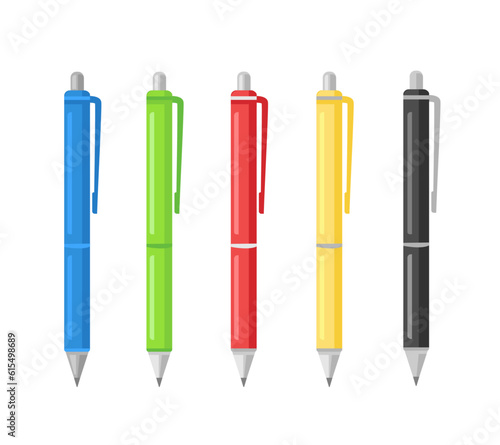 Set of colorful pen. Classic colors, icons. Blue, red, green, yellow, black pens. Stationery template. Ballpoint. School tool mockup for design, presentations, posters, apps