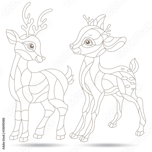 Set of contour illustrations of stained glass Windows with fawns , dark outlines on a white background