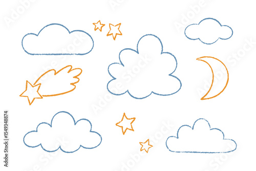 cloud, star, moon, crescent, falling, crayons, wax crayons, chalk, texture, hand-drawn, childish, children, children, set, collection, blue, yellow, cute, authentic, whimsical, trendy, drawing, design, element, art, doodle, icon, cut-out, isolated, grunge, gritty, vector, illustration, graphic, vignetting, shape, pastel, scribble, children, simple, irregular, vintage, symbol, paint, brush