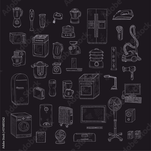 set, stove, appliance, hot drink, object, oven, kitchen, element, equipment, icon, device, maker, electric, iron, doodle, domestic, toaster, machine, drawn, household, vignetting, vector, home, cooking, utensil, hardware, helper, tool, grinder, mixer, deep freezer, blender, juicer, coffeemaker, kettle, scale, refrigerator, cooker, pressure cooker, hair drier, washing machine, boiler, vacuum cleaner, heater, television, computer