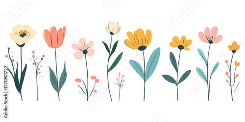 Set of cute, simple, flat spring flower clip art, vector illustration on a white background