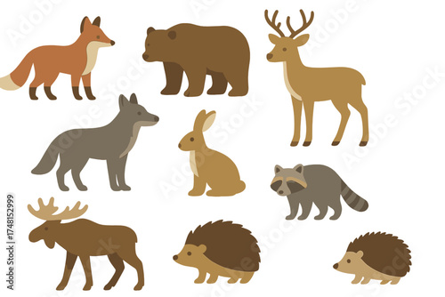 animal, timberland, fox, bear, cervid, wolf, rabbit, moose, raccoon, hedgehog, cute, set, forest, wildlife, nature, fauna, stylised, cartoon, isolated, mammal, wild, simple, collection