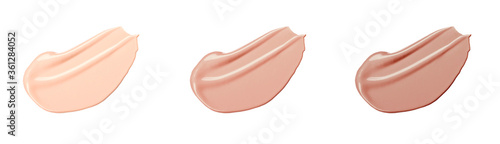 Set of delicate tonal Foundation smears for different skin colors on white background isolated. Light beige smudge of tone. Pastel shades of BB cream. Cosmetic product for makeup and skin care. Banner