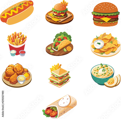 fast food, vector, illustration, burger, hot dog, french fries, taco, sandwich, burrito, chips, hummus, junk food, take-away, snack, meal, crispy, cheese, sauce, digital artwork, colourful, eatery, appetising, graphic design, pizza, hamburger, food, icon, fast, set, illustration, cartoon, meat, menu, bread, hot, lunch, dinner, tomatoes, bun, hot dog, dessert