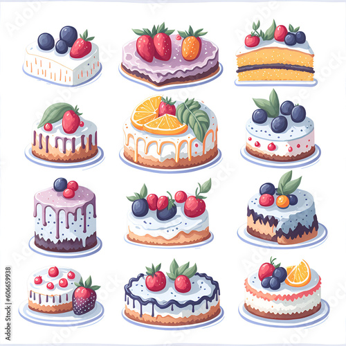 Set of detailed Sticker of Watercolor cute cake with fruits watercolor