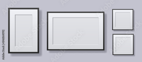 Set of different black photo frame with white passepartout on gray wall. 3D Vector template illustration