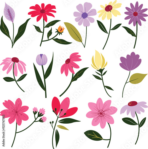 Set of different tipes of illustration of flowers with green leafs on a white background