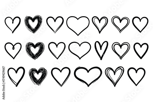 Set of diverse handdrawn heart icons, isolated on a transparent background