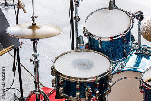 set of drums, cymbals and microphones on pavement background closeup