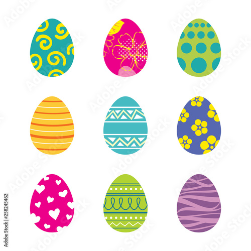 Set of easter eggs isolated in white background. Vector modern new design with different colors and patterns.