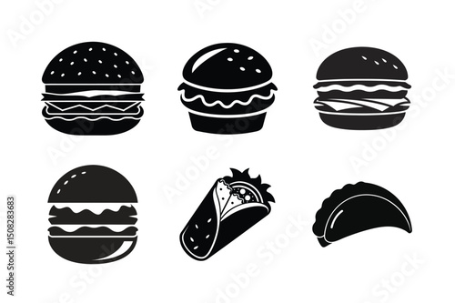 fast food, silhouette, food, vector, icon, hat, set, illustration, hamburger, burger, cake, fast, cartoon, cap, symbol, dessert, bread, design, collection, signs, candy, icon, sandwich, meal, fashion, chocolate, drawing