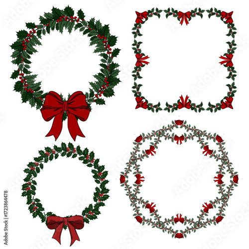 Set of festive Christmas wreaths and holiday decorations. Greeting cards, invitations, posters, planners, clipart.. Cozy and cheerful winter illustrations full of seasonal charm and holiday spirit