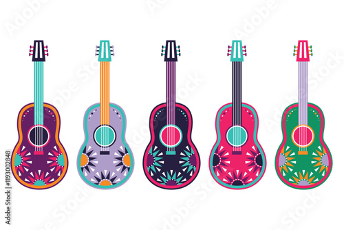 Set of five Mexican guitars with ornaments. Vector illustration of musical instrument, icon.