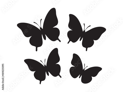 Set of four black butterfly silhouettes on white background. concept of nature, insects, wildlife, icon, design element, decorative art, tattoo ideas, elegance, symmetry