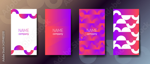 Set of four bright color vertical abstract business cards with graphic elements and text.