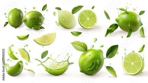 Set of fresh delicious limes splashing with leaves, cut out