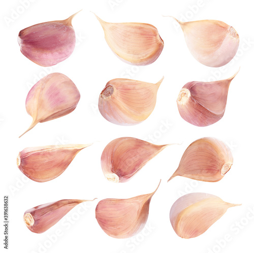 Set of fresh garlic cloves on white background