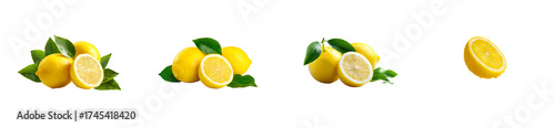 Set of Fresh Yellow Lemons with Green Leaves and Water Droplets