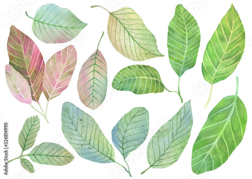 Set of fruit colorful leaves on a white background. Watercolor illustration. Isolated objects on a white background.