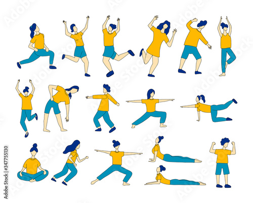 Set of girls doing sport or yoga vector cartoon illustration on white background.