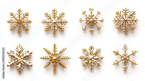 Set of gold christmas snowflakes on white background.