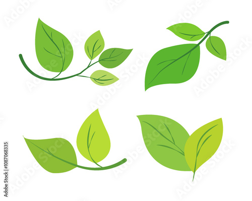 set of green leaves in various shapes and arrangements. Minimalistic graphic style on a white background. The concept is related to nature, eco-friendly logos, gardening, and environmental icons