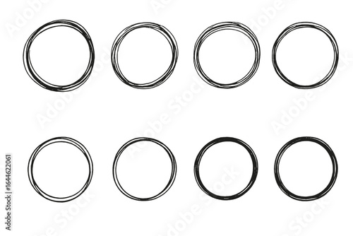 Set of hand drawn circle frames. Sketchy doodle round borders. Abstract black ink design elements. Minimalist circular shapes. Perfect for logos, icons, and graphic design.