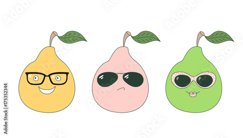 pear, funny, face, face, sunglasses, goggles, lady, girl, woman, boy, man, smile, mouth, lip, eye, set, collection, stem, leaf, funky, cute, bright, cool, trendy, vector, comic, cartoon, character, fruit, hand, drawn, doodle, illustration, isolated, object, white, background, design, pink, green, orange, element, pin, hipster, patch, humor, together, retro, small