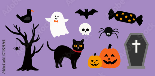 Set of Hand drawn Halloween element flat vector illustration. Collection of cute pumpkin, spooky tree, black cat, white ghost, skull, spider, tombstone, candy, bat, crow. For sticker, card, poster.