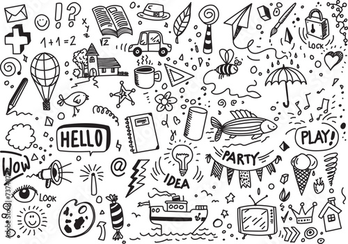 vector, doodle, graphic, set, element, illustration, different, art, cartoon, paper, white, idea, bulb, television, play, artistic, pen, party, note, chicken, home, crown, wow, fish, ship, sea, car, letter, mail, lock, book, break, rain, umbrella, candy, music, cloud, thinks, sun, nubes, love, hat, eye, look, cyberspace, computer, symbol