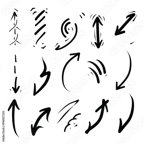 Set of hand-drawn arrow icons in various styles and directions on a white background.