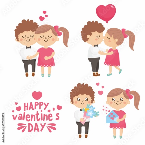 Set of happy Valentine's Day couple in love on date. Romantic relationship lover illustration. Boyfriend give flower.