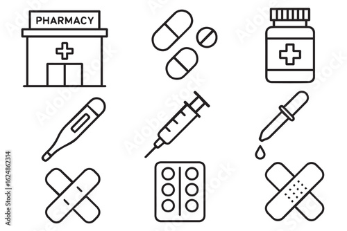 Set of healthcare icons illustrating pharmacy essentials such as medicine bottles, band aids, syringes, and pills for medical use pharmacy essentials graphics