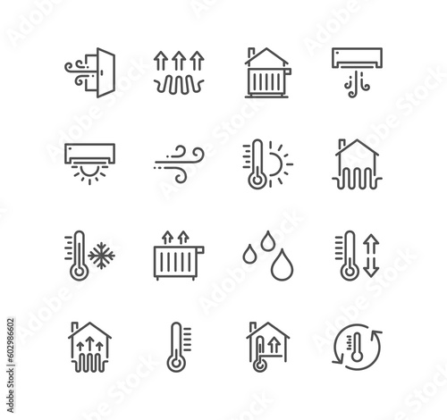 Set of house heating related icons, heat supply, heating boiler, water heater, gas and electric heating and linear variety symbols.
