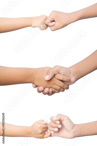 Set of human hand gestures featuring fist bumps and a handshake isolated on transparent background. Concept of teamwork, agreement, friendship, and cooperation.
