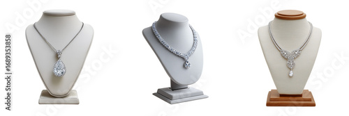 Set of Indian bridal jewelry display, cubic zirconia silver plated necklace with matching earrings on transparent png background. Ai generated