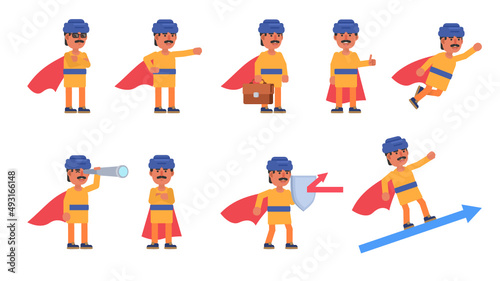 Set of indian or hindu businessman in super hero cloak in various situations. Modern vector illustration
