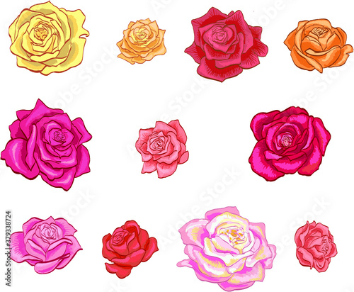 rose, flower, beautiful, vector, isolated, set, colourful, summer, floral, vintage